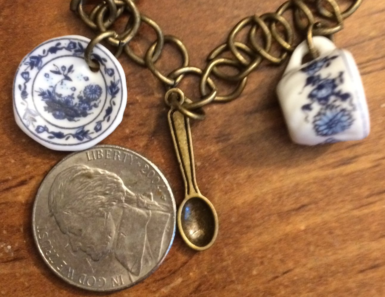 Three charms on an antique gold plated bracelet: tea cup, saucer, and spoon