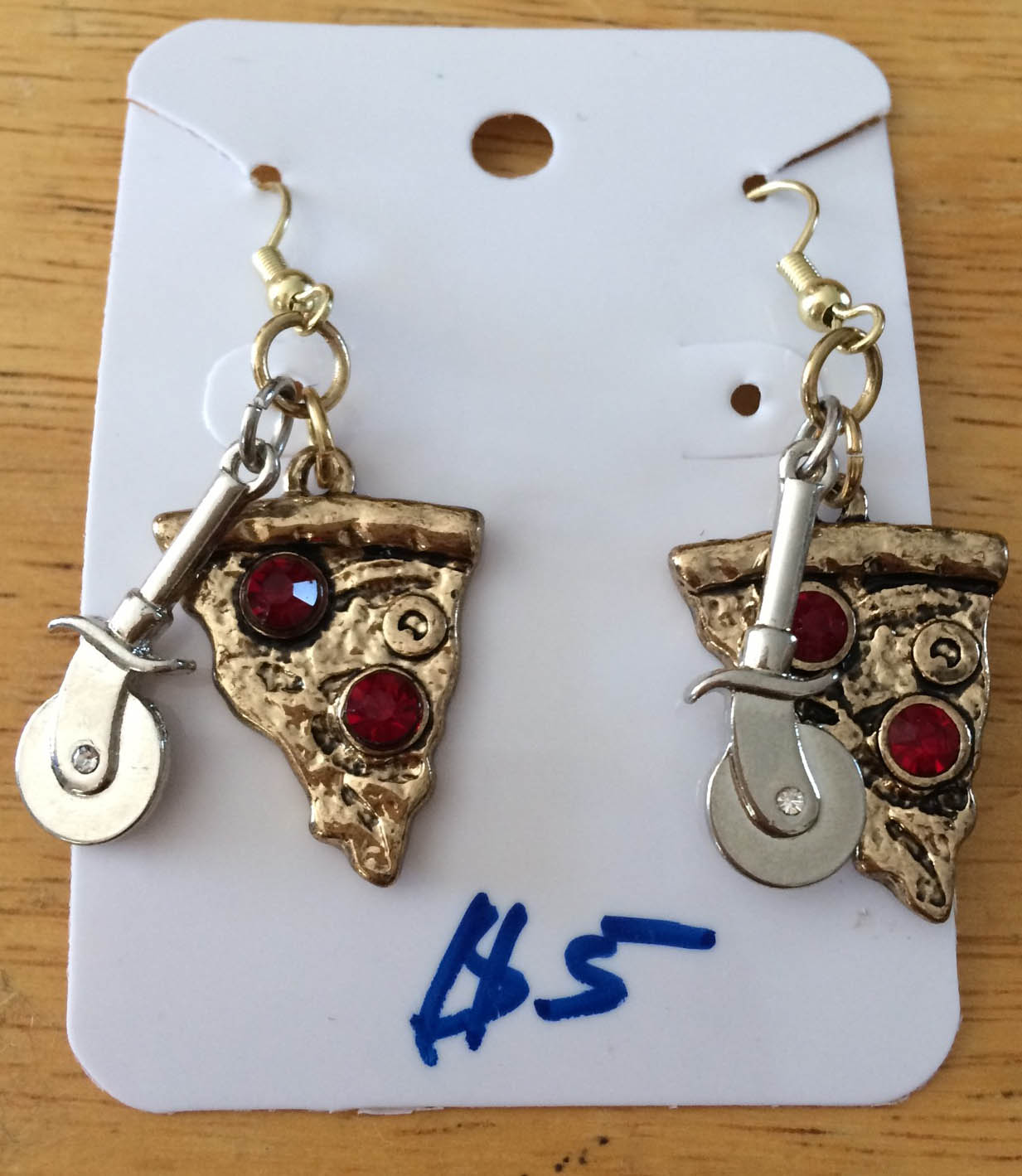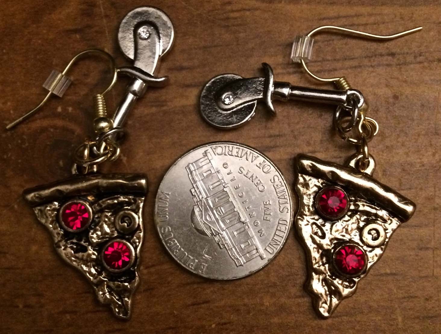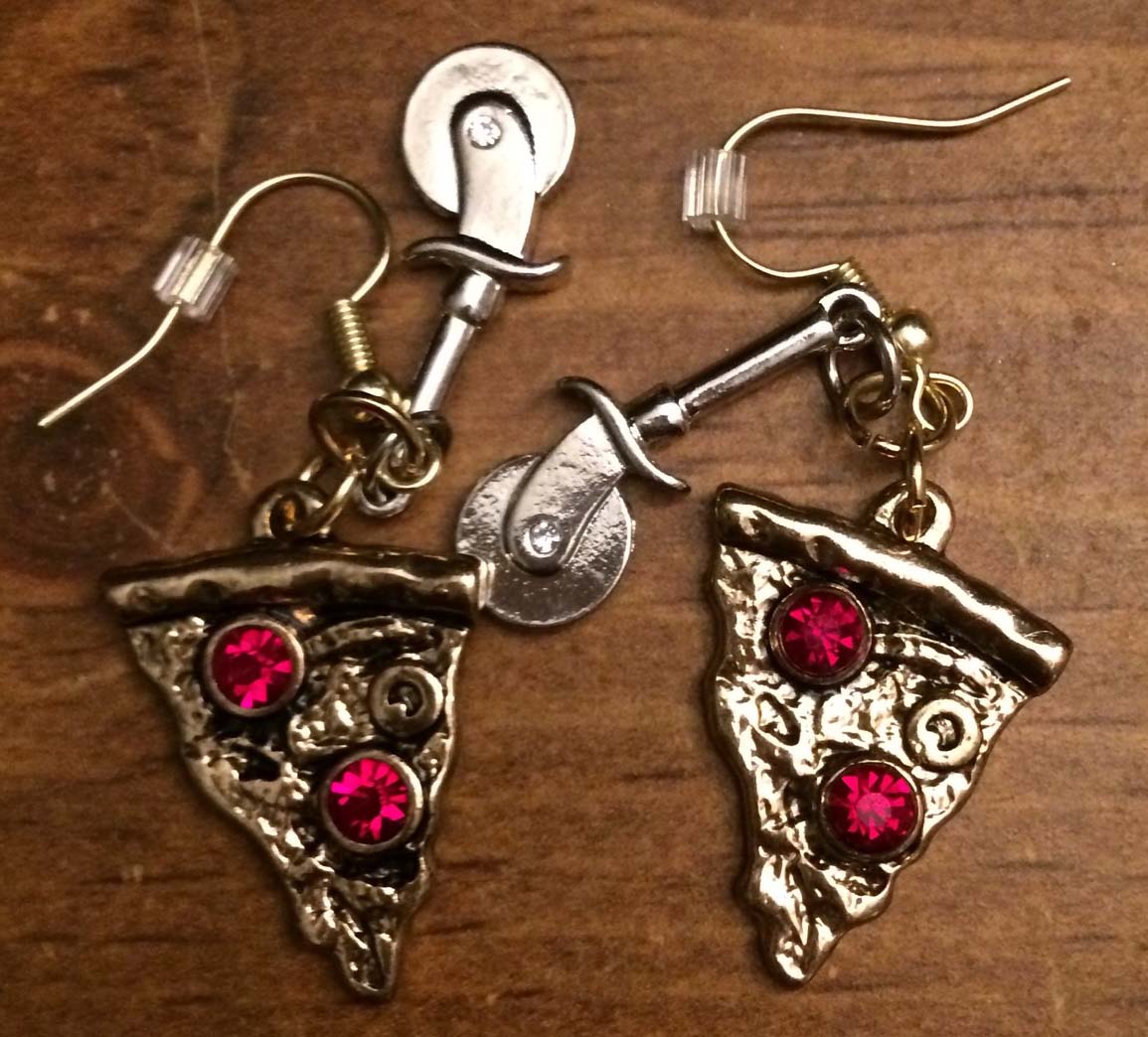 Gold and Ruby Pizza Slices with Silver Pizza Cutters on Gold Fishhooks