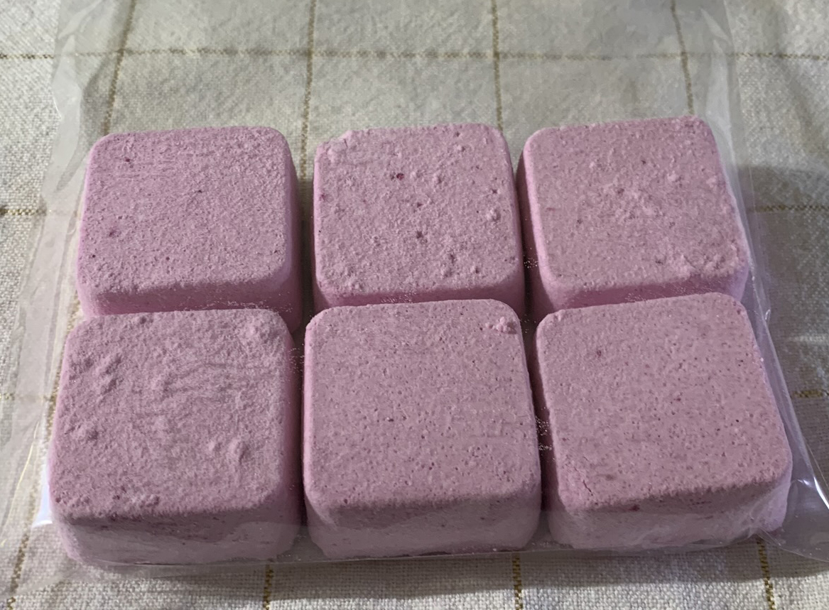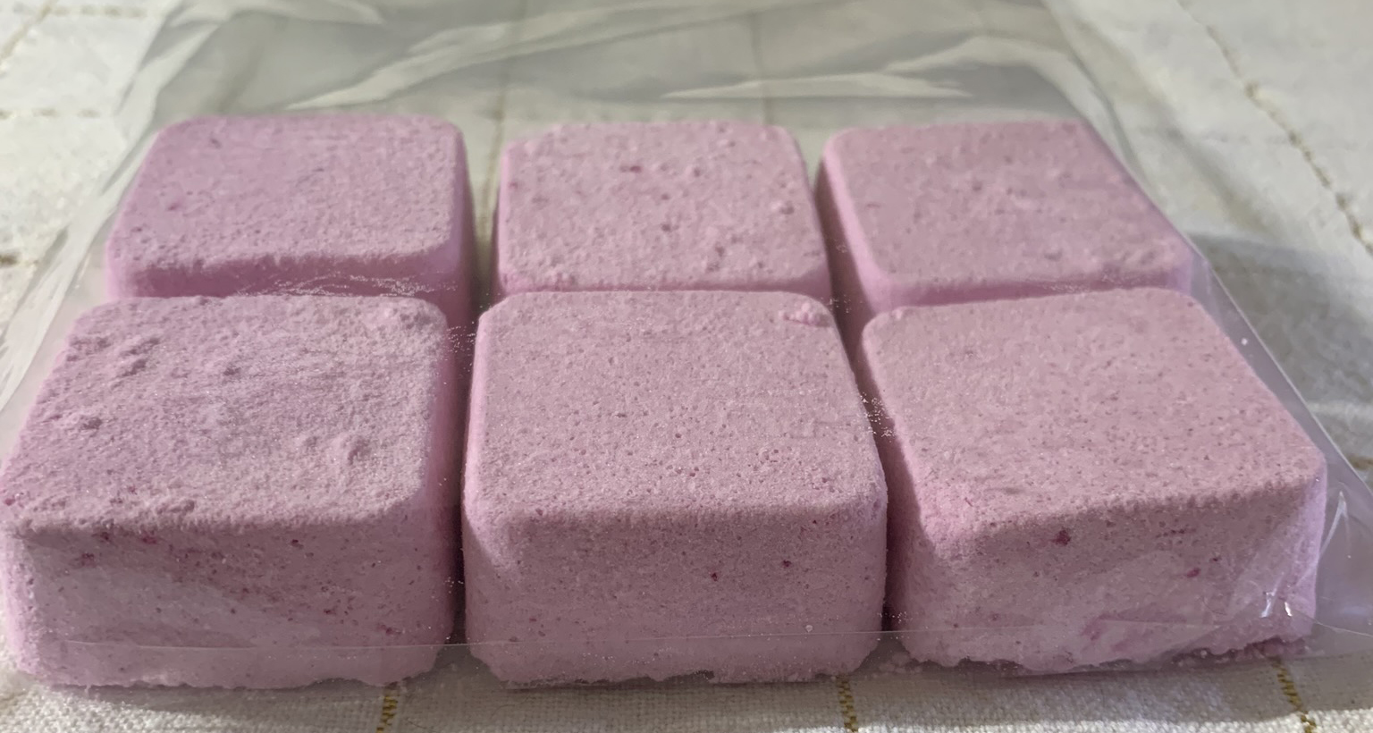 Ingredients: Sodium Bicarbonate/Corn Starch blend, Citric Acid, Water, Jojoba Oil, Macintosh Apple Scent, Pink dye