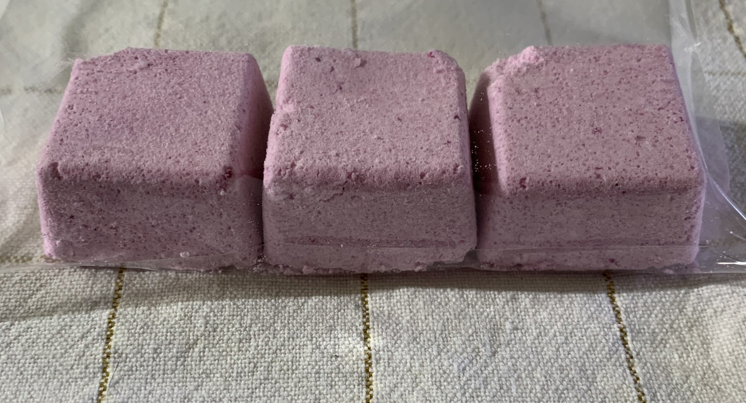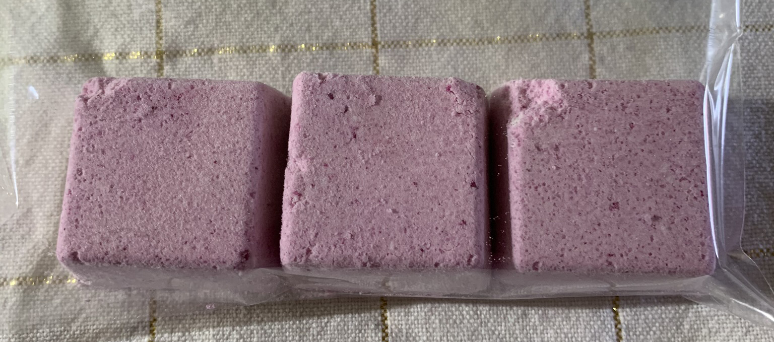 Ingredients: Sodium Bicarbonate/Corn Starch Blend, Citric Acid, Water, Jojoba Oil, Macintosh Apple Scent, Pink Dye