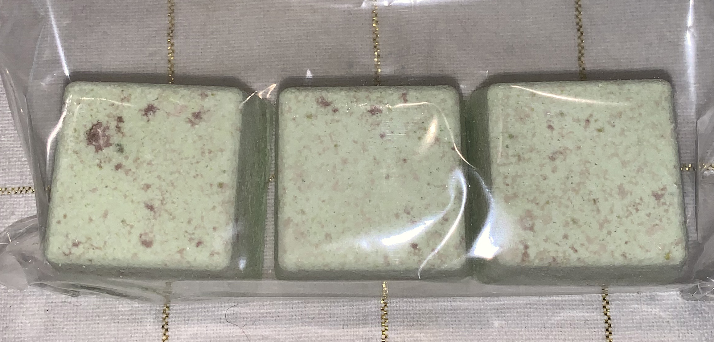 Ingredients: Sodium Bicarbonate/Corn Starch Blend, Citric Acid, Water, Coconut Oil, Peanut Butter Cookie Fragrance Oil, Green Dye