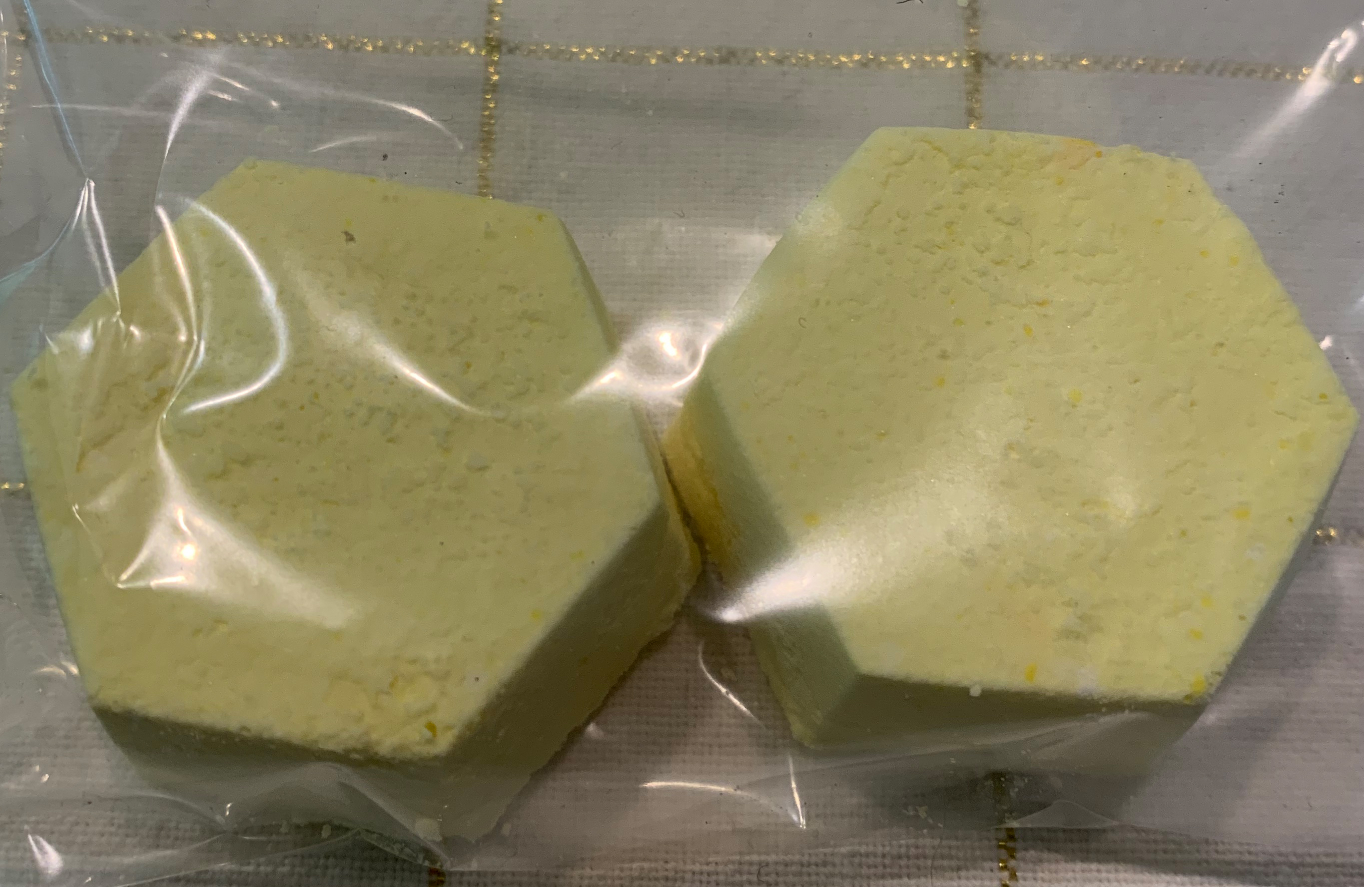 Ingredients: Sodium Bicarbonate/Corn Starch Blend, Citric Acid, Water, Jojoba Oil, Cinnamon Buns Fragrance Oil, Yellow Dye